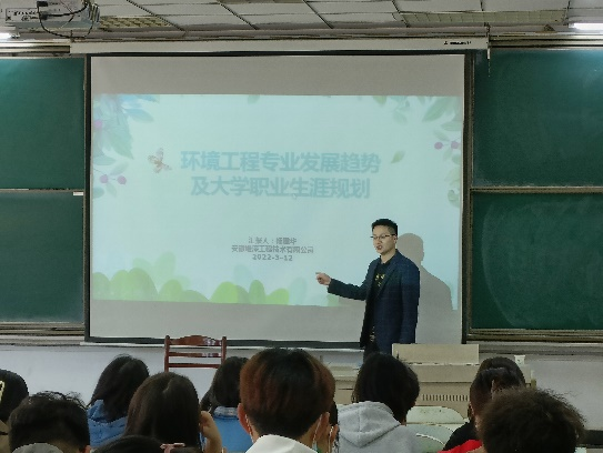 2022年3月12日上午,安徽维深工程技术有限公司副总经理杨建华应邀来校与大一学生开展交流,学院副院长盛广宏和环境系主任贾勇参加了交流。杨建华系我校2016届环境工程本科毕业生和2018届环境工程专业硕士毕业生,2019年创办安徽维深工程技术有限公司。杨建华结合当前国家政策、污染现状、环保工程和环保技术案例,深入介绍了我国环境保护的现状和发展趋势,以及当前社会对环保类人才的能力要求;结合自己的求学和工作经历,对大一学生的学业生涯规划进行了指导。同时与大一学生就工作实习、专业发展前景等进行了互动交流。