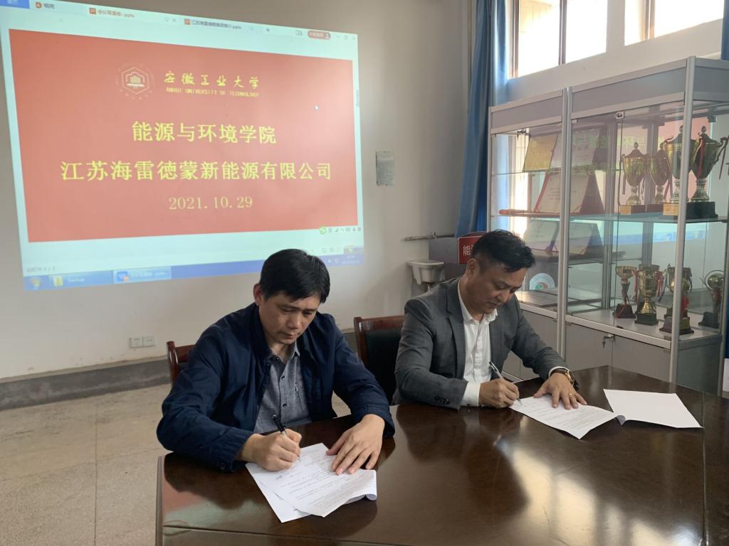 10月29日下午,学院与江苏海雷德蒙新能源有限公司在能源楼307会议室举行校企合作签约仪式。江苏海雷德蒙总经理郑海青、学院党政负责人及部分教师代表出席。签约仪式由学院院长钱付平主持。