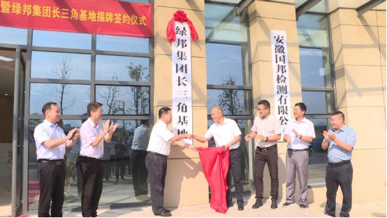 凤杰与陈旭为绿邦环境集团安徽国邦检测有限公司“产学研合作基地”揭牌。