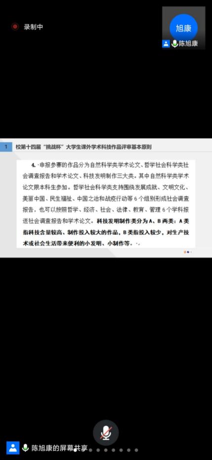利用腾讯会议形式于线上举行了“挑战杯”大学生课外学术科技作赛启动仪式。启动仪式邀请了参赛经验丰富的陈旭康同学进行参赛经验宣讲培训,91tv