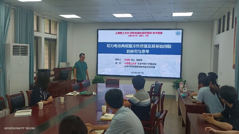 随后,上海理工大学方奕栋副教授为师生做了题为“动力电池两相直冷热管理及其基础问题的研究与思考”报告,精彩的报告引发了师生和方教授的热烈讨论交流。报告会后,双方围绕学科发展、人才培养、队伍建设、学生工作等方面进行了深入交流。