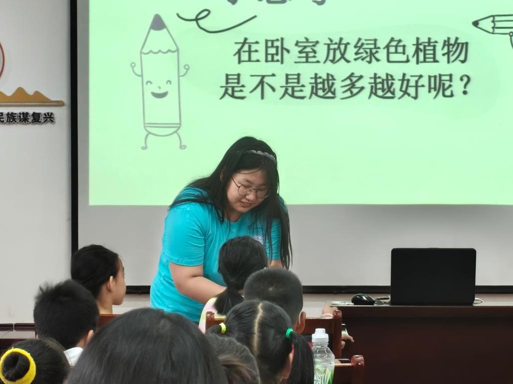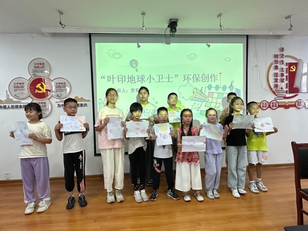 在创作结束后的互动交流环节,孩子们踊跃分享感受,纷纷表示要爱护花草树木,让地球更美丽。实践队队员肯定并鼓励他们的想法,还引导思考日常环保行动,孩子们积极响应,承诺从自身小事做起保护环境。